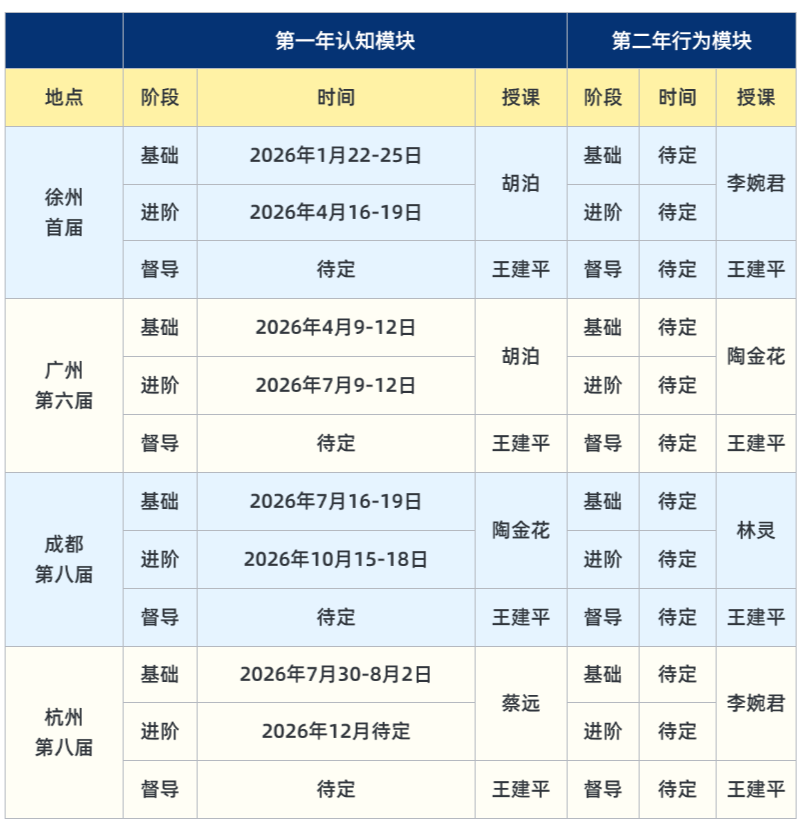 ★ 督导形式:2天面授+2天网络 或 8次网络督导,具体形式待定。请以课前实际通知为准,督导班培训费不因培训形式区分,各形式进行均收费一致。