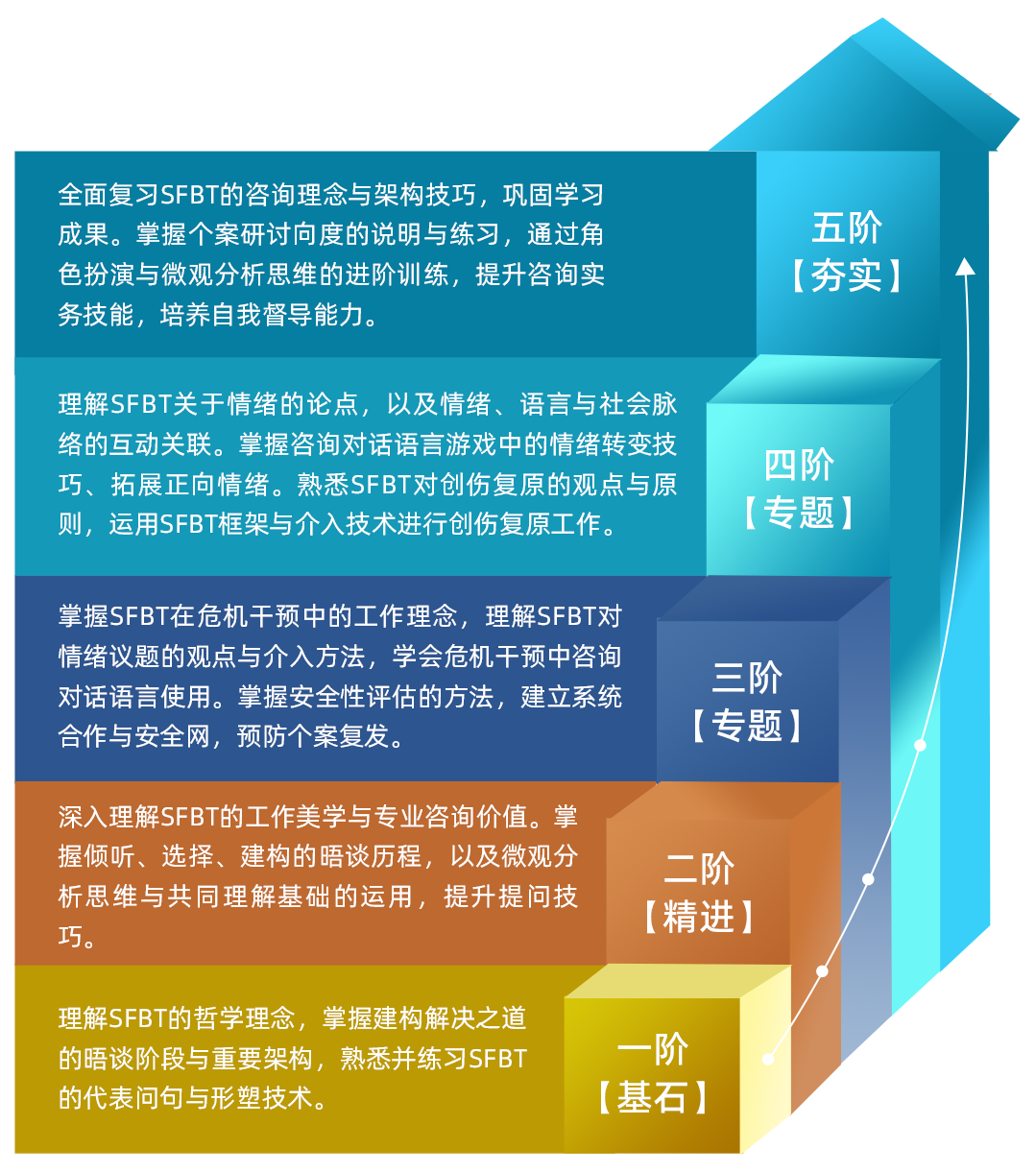 本课程为两年五阶系统培训,融合了【理论技术+多元议题+实务演练】三大核心要素,确保各阶段之间既循序渐进又相互支撑,形成一个完整、连贯的知识体系,逐步深入SFBT的广阔领域。