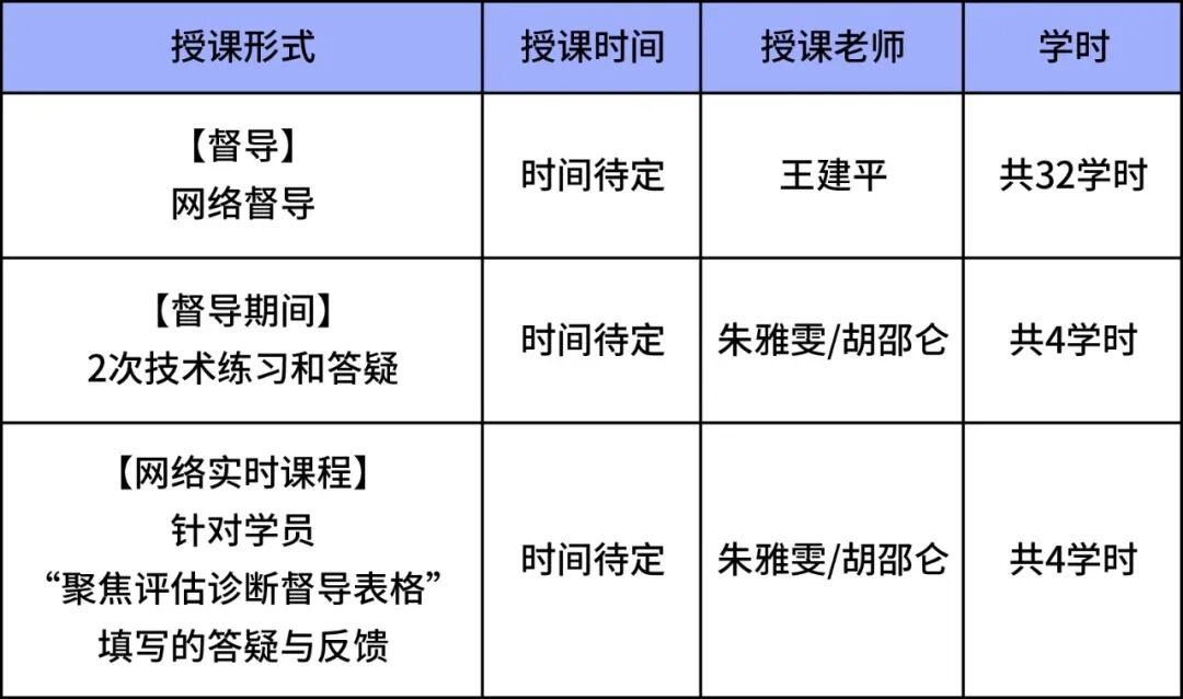 为了更好地提升学员对不同案例评估诊断的实践能力,在进阶课程与督导之间,将组织聚焦于评估诊断网络团体督导,每月1次,每次2小时,共5次,督导师为朱雅雯和胡邵仑,学员人数10-20人,只接受本项目组学员报名。