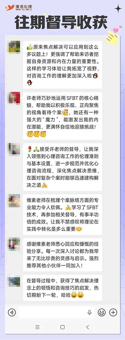 漫语心理与SFBT华人领域最具影响力的专家之一、卓越的SFBT训练师及督导师——许维素博士携手合作多年,共同推进“焦点解决短期治疗系统培训”(整体架构详见文末),此培训项目广受赞誉,收获了业界的一致好评。