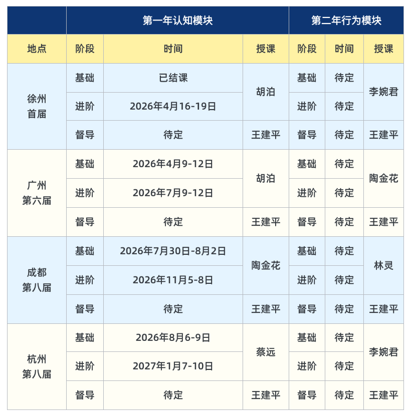 免责声明:以上安排为预定开课时间,如因自然灾害、极端天气、疾病暴发等一切不可抗力因素以及达不到最低开班人数,本平台有权取消或推迟。