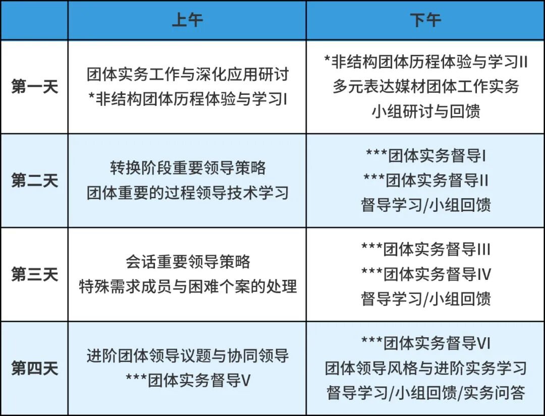本课程采用多元化的授课方式,涵盖实务理论讲授、体验性活动、团体方案示范与演练、团体过程与咨询体验,以及深度实务研讨与分享等多个环节。特别在课程的第二、三阶段,强化了实作能力的培养,并融入了实务实习与督导方式,旨在全方位深化受训者的实务能力。