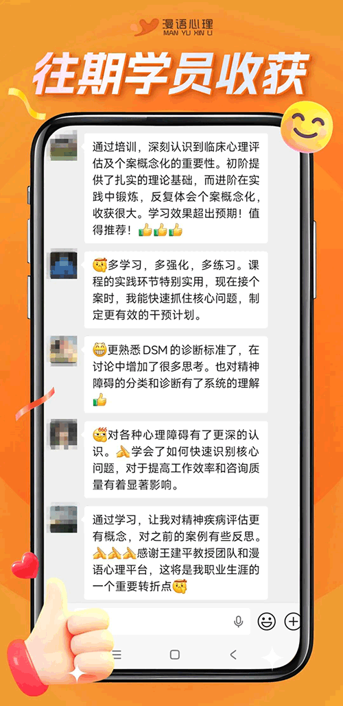 1、结课后,颁发由漫语心理培训平台盖章,王建平教授、朱雅雯副教授、胡邵仑副主任医师 签名证书。
