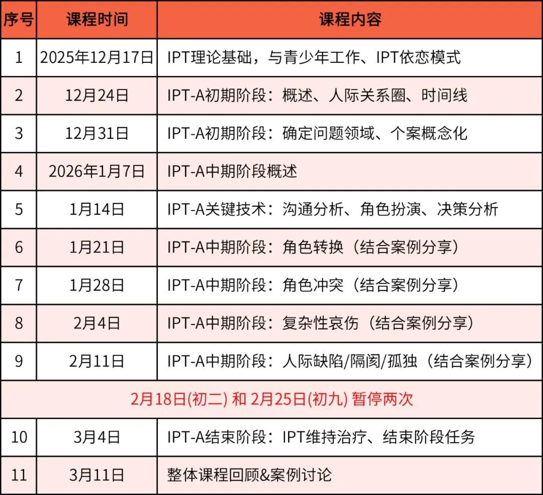 时间限定性:IPT-A通常是一个为期12周的短期治疗,治疗周期较成人IPT短。这主要是考虑到青少年的特殊发展阶段和学校生活节奏。