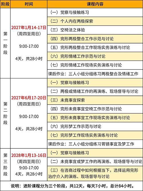 本课程针对想将完形治疗的咨询历程与技术应用于实际助人工作的学员而设计。课程将衔接完形治疗初阶课程所奠定的理论基础与体验觉察经验,通过课堂现场演练与课后分组练习,让学员不只懂概念,还能练习完形咨询的实务操作,进而将完形咨询运用到咨询助人专业工作中。进阶课程共分三个阶段,内容包括: