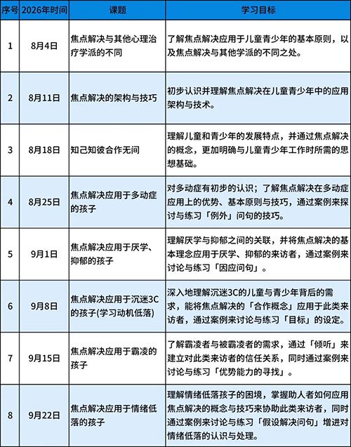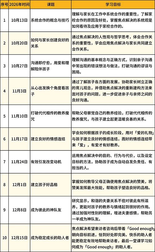 课程融合了三大模块:“【初阶网课】理论奠基与场景应用+【进阶面授】非自愿个案突破与实战演练+【网络督导】持续支持与专业精进”,旨在通过系统化的学习与实战演练,帮助教育工作者、心理咨询师及其他专业助人从业者,掌握一套高效、积极的干预方案,从“关注问题”转向“构建解决”,真正陪孩子在困境中看见光,成为儿童青少年心理健康的守护者。